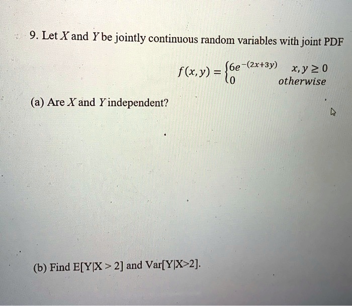 Source: https://www.numerade.com/ask/question/9-let-xand-ybe-jointly-continuous-random-variables-with-joint-pdf-2x3y-fxy-6e-xy-20-otherwise-a-are-x-and-y-independent-b-find-eyix-2-and-varyix-2-47959/